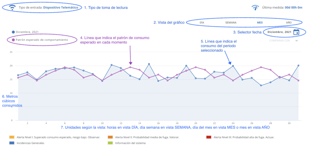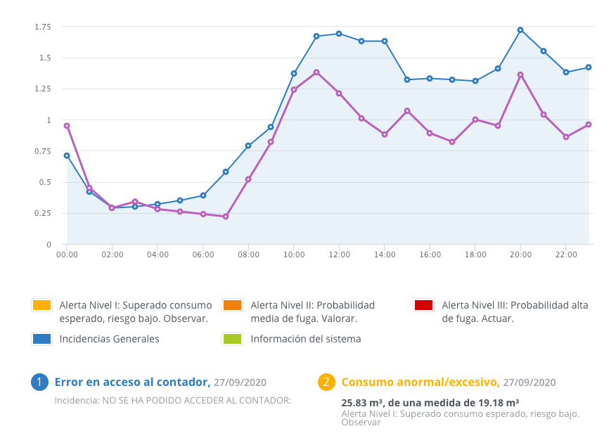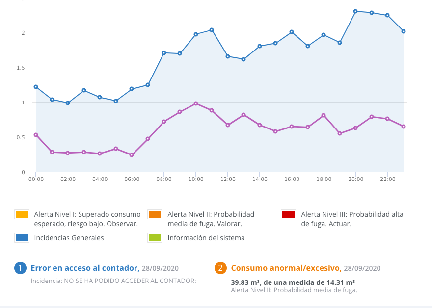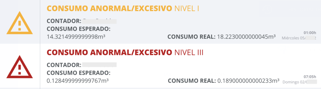 Como se puede observar, el sistema te indica en cada alerta la diferencia en m3 que se está produciendo entre el patrón esperado y el consumo real.