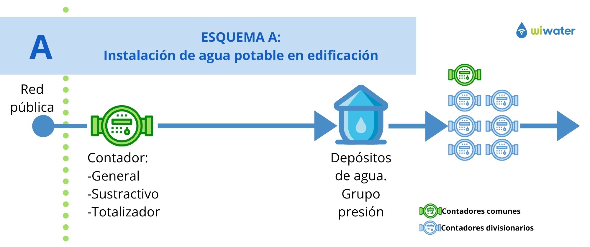 Esquema de instalación tipo A: Existe una entrada única de abastecimiento de agua a la comunidad, CON o SIN contador general/totalizador/sustractivo.